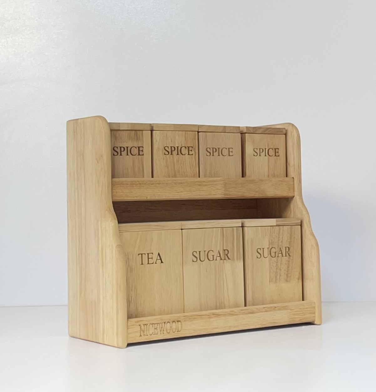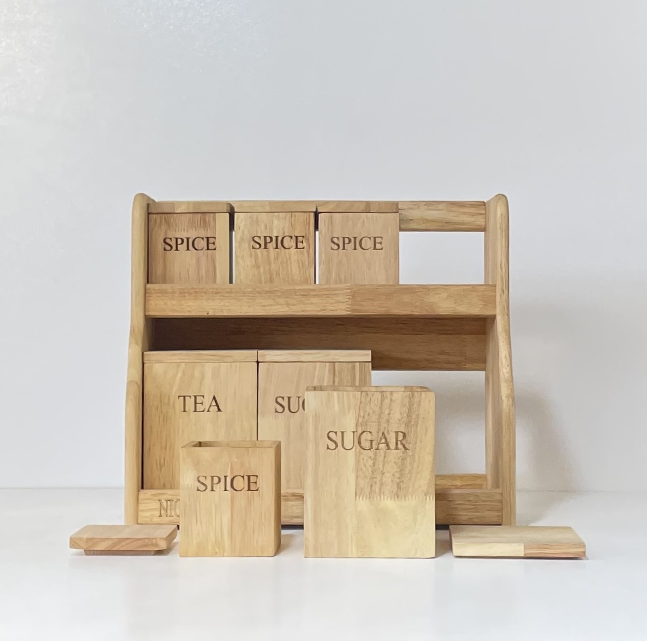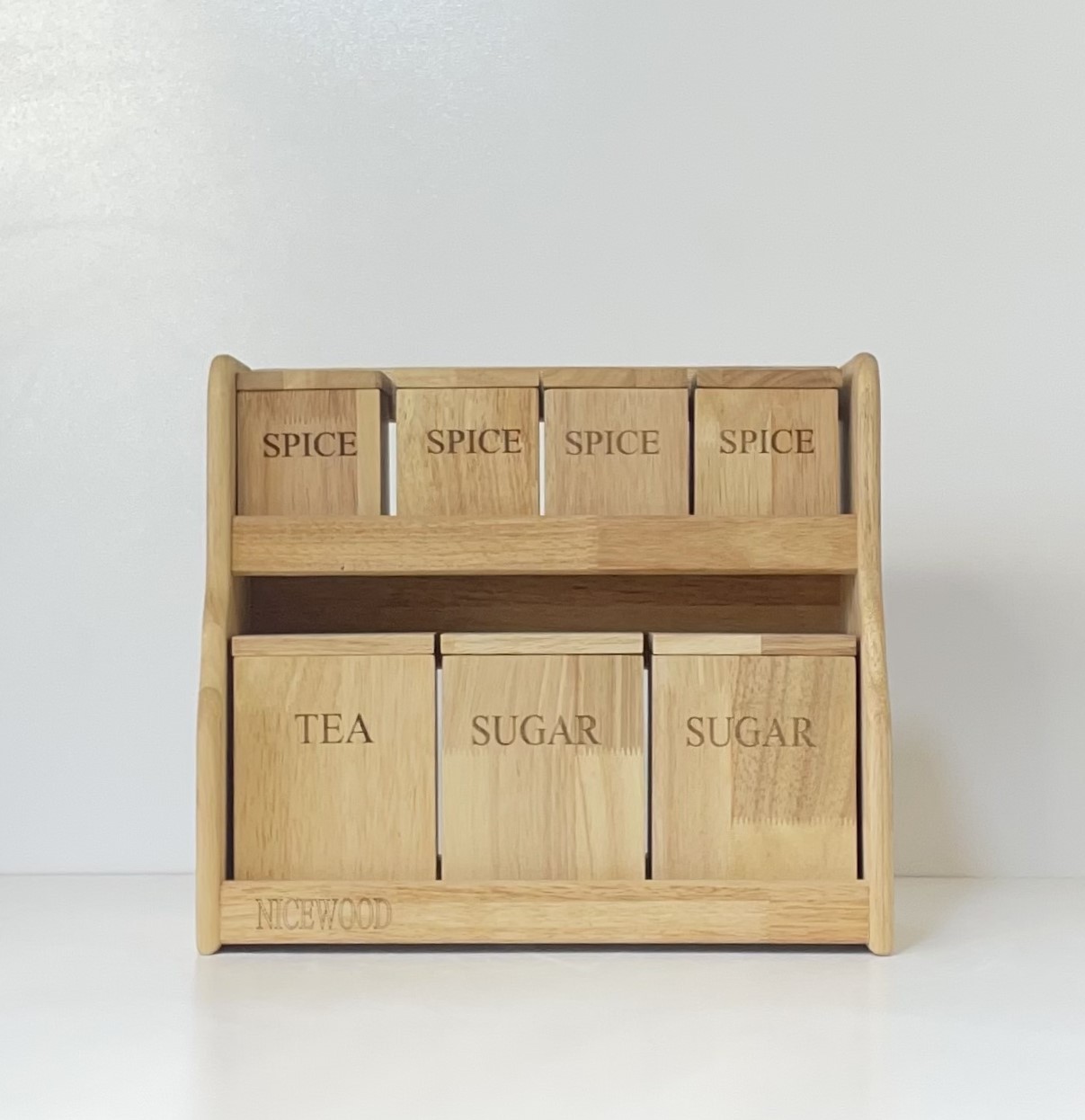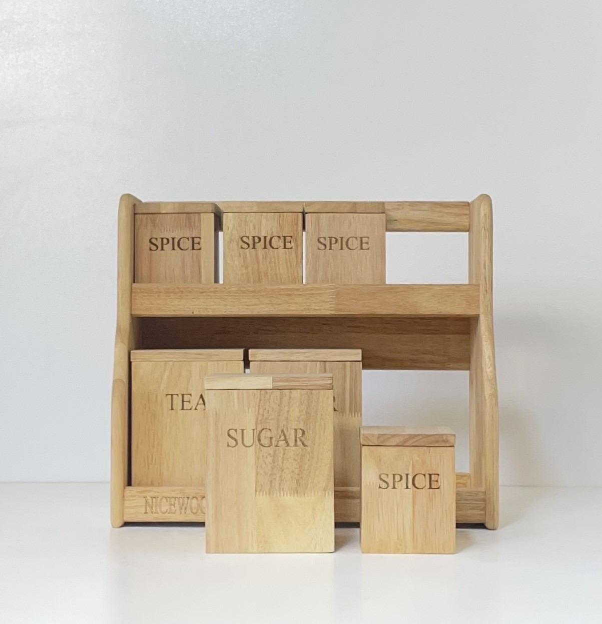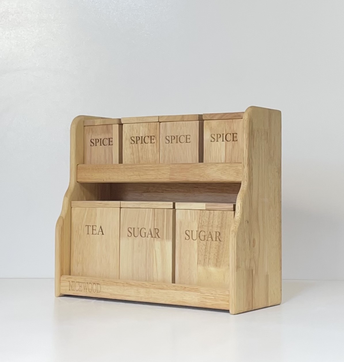 این ست شامل چندین بانکه چوبی با دربهای محکم است که روی یک استند دو طبقه قرار گرفتهاند. طراحی دو طبقهای این محصول باعث میشود که فضای کمتری اشغال کند و در عین حال دسترسی به ادویهها آسانتر باشد.